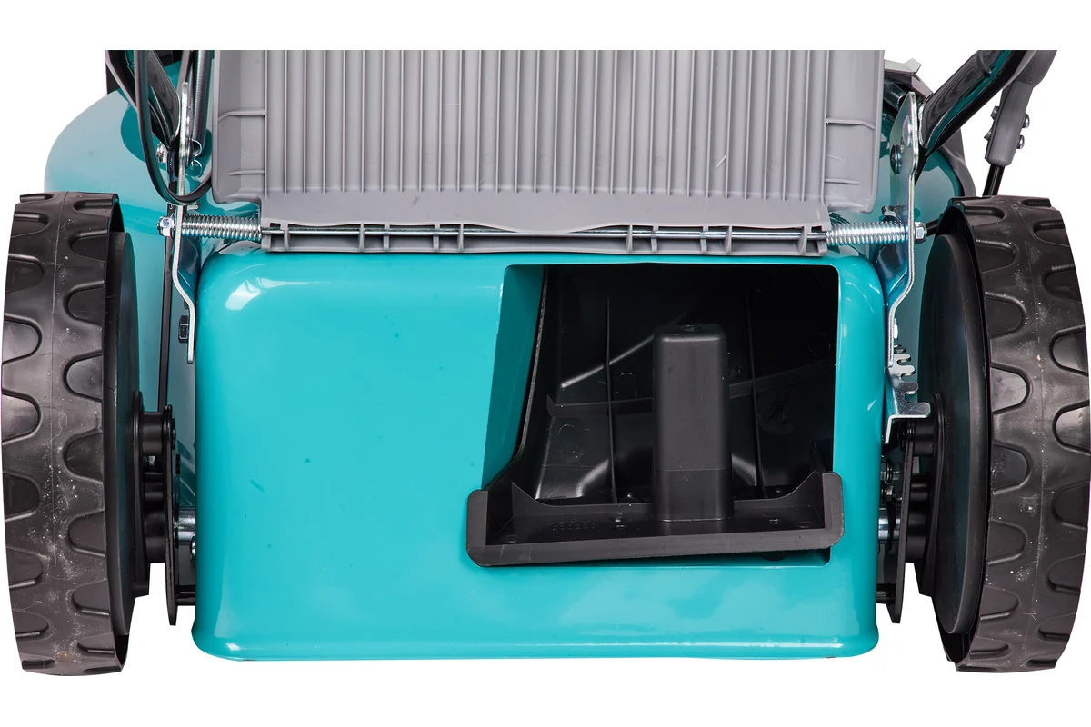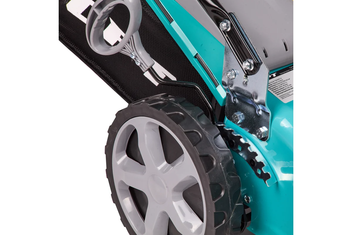 -Высокое качество материалов Усиленная металлическая дека из стали толщиной 1,6 мм, травосборник из пластика и сетки, колеса диаметром 25/18 см на подшипниках для улучшения маневренности делают технику долговечной