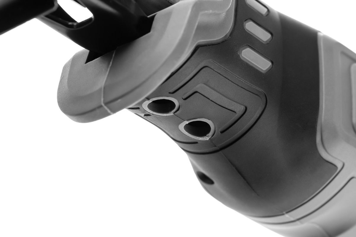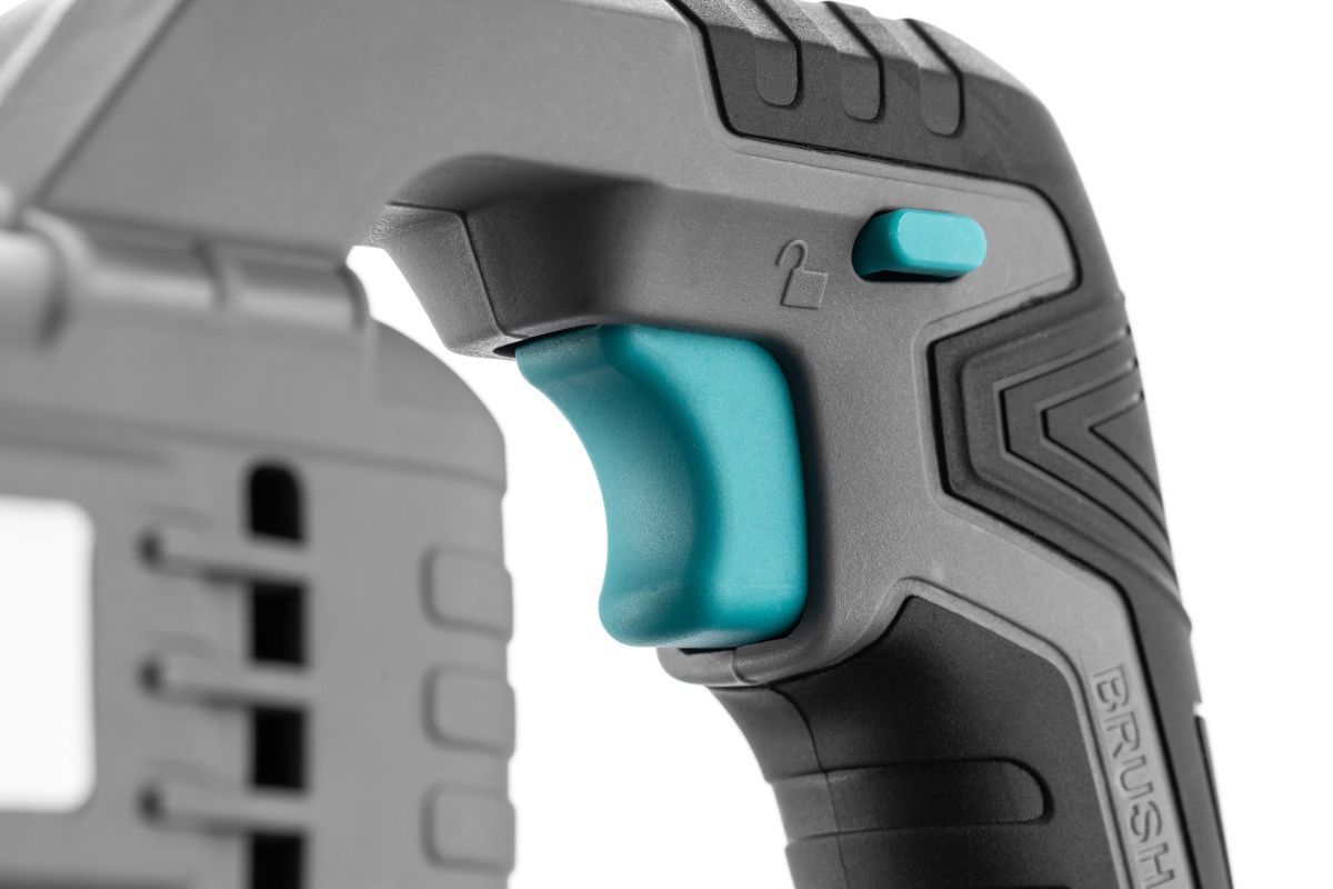 - Особенностью модели является бесщеточный двигатель, который определяет малый вес и линейные размеры, а также высокую производительность и ресурс инструмента.