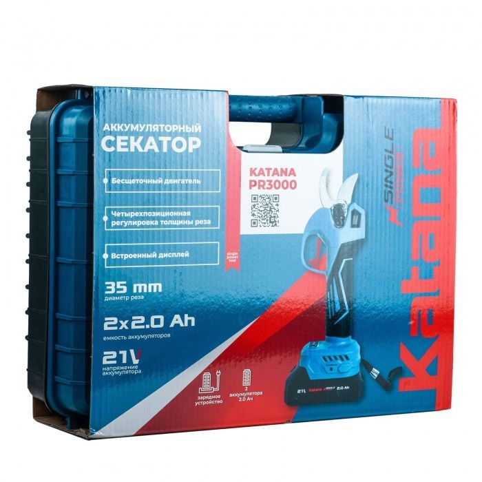 Аккумуляторный секатор Katana PR3000 обеспечивает мощный и чистый рез ветвей диаметром до 35 мм, включая твёрдую древесину. Оснащён бесщеточным двигателем для высокой производительности, низкого шума и долговечной работы. Комплект включает два аккумулятора Li-ion ёмкостью 2,0 А·ч каждый, зарядное устройство и прочный кейс. Четырёхпозиционная регулировка толщины реза позволяет точно настроить инструмент под тип обрезаемых веток. Встроенный дисплей отображает уровень заряда и режим работы. Эргономичная рукоятка с противоскользящим покрытием обеспечивает комфорт и надёжный хват даже при длительной работе.