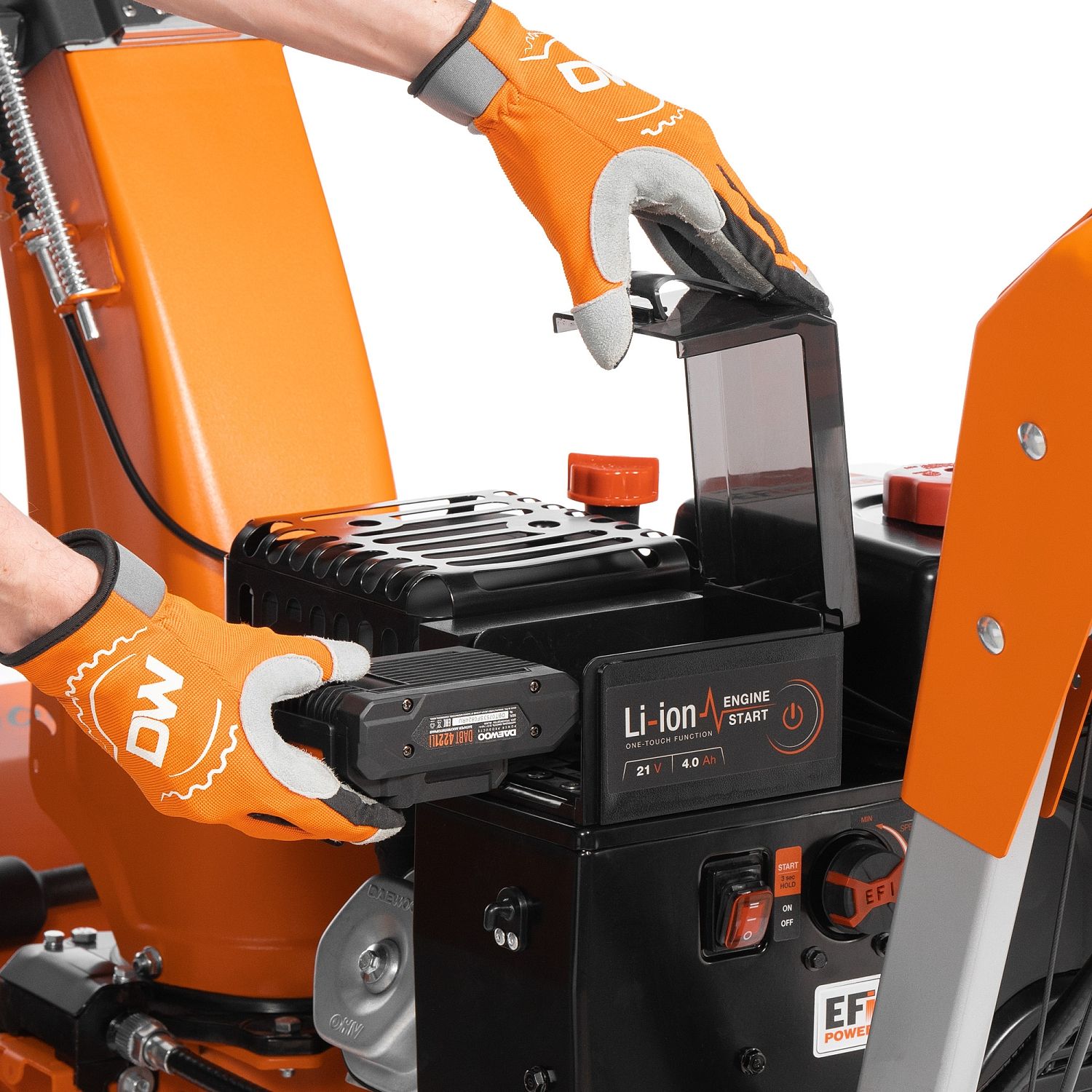 - Электрозапуск от аккумулятора. Благодаря установленному Li-ion аккумулятору на 21В, двигатель запускается простым нажатием кнопки на рукоятке управления. Обеспечивает легкий запуск холодного двигателя при любых температурах до -30˚C.