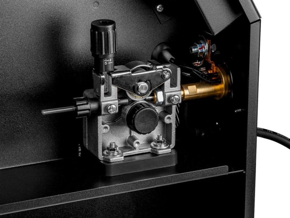 Аппарат оснащен ЕВРО-разъемом, горелкой MIG 3 метра и возможностью смены полярности для сварки проволокой без газа (FLUX).