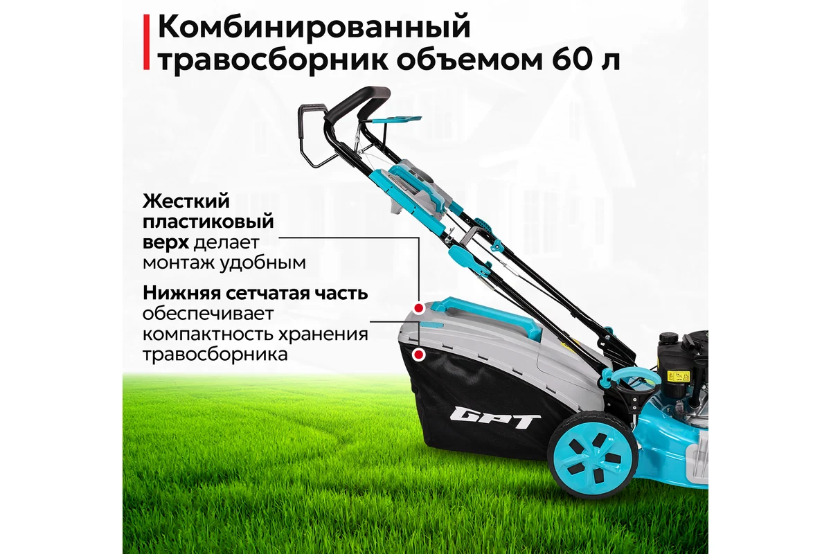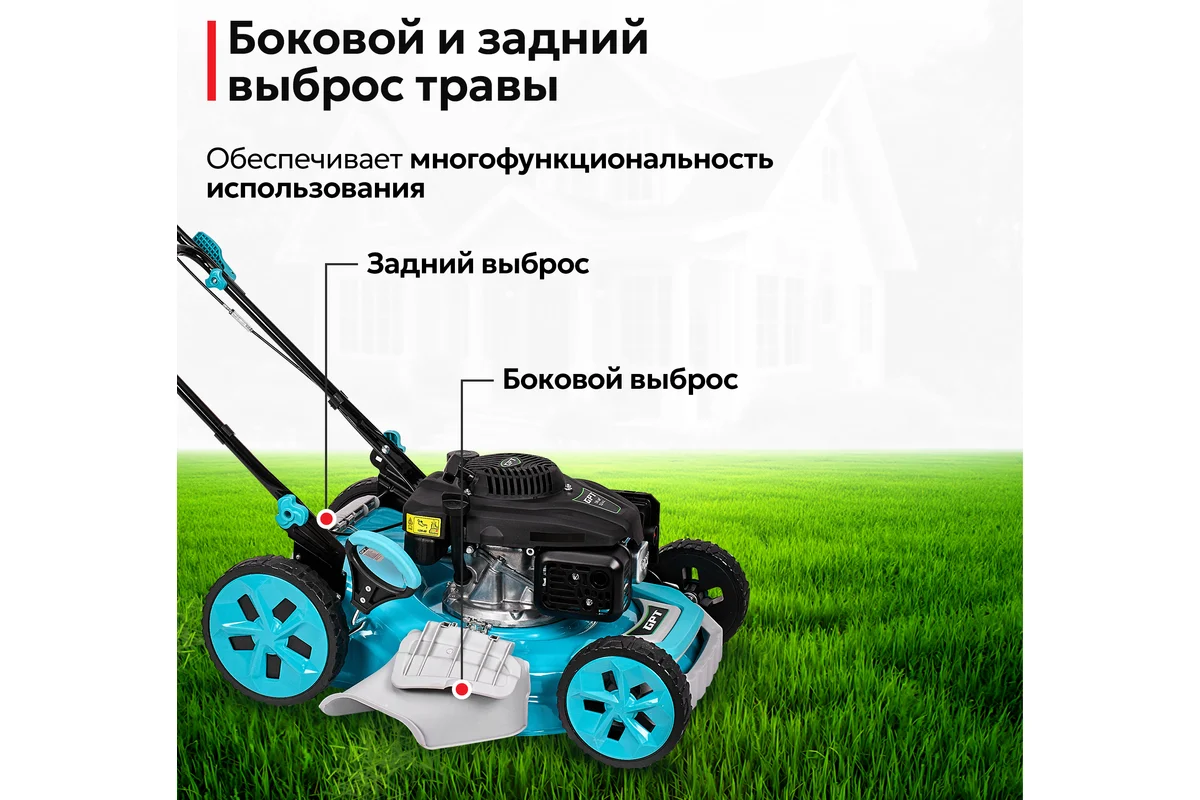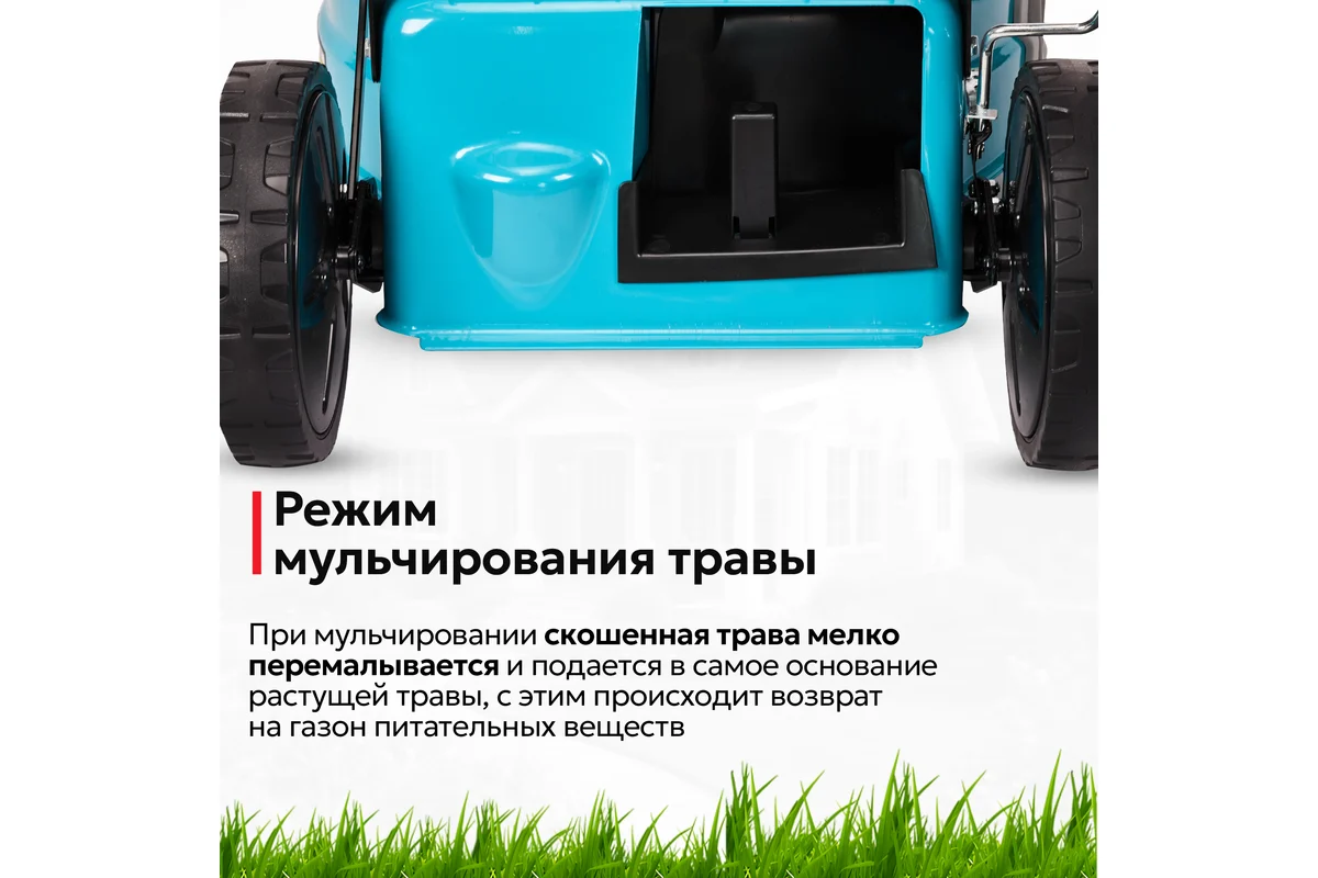 -Боковой и задний выброс травы, а также функция мульчирования, с помощью которой скошенная трава перемалывается и подается в основание газона для насыщения питательными веществами. Трава собирается в травосборник объемом 60 литров.