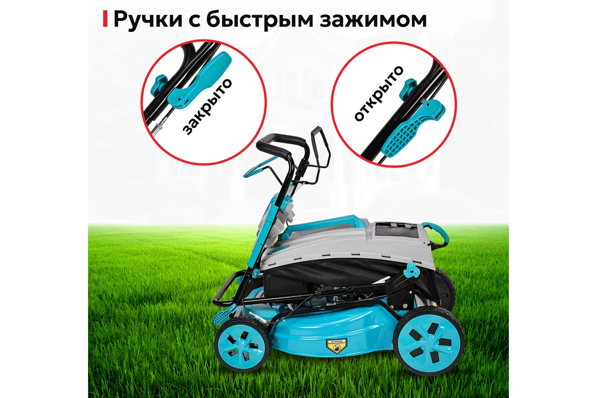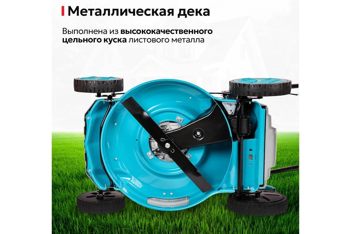 -Высокое качество сборки и материалов. Дека из цельного листа металла толщиной 1,5 мм, травосборник из пластика и сетки, высоко расположенный масляный щуп для быстрого доступа к маслу, автоматическая заслонка.