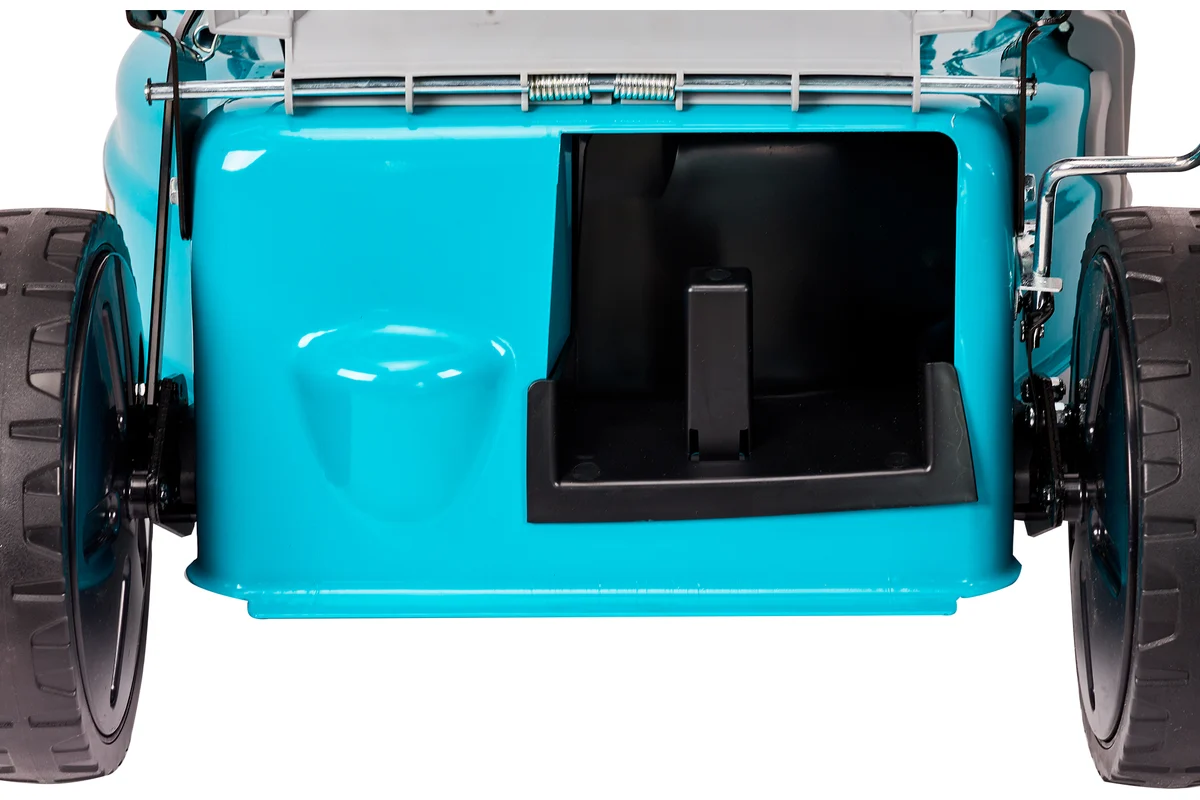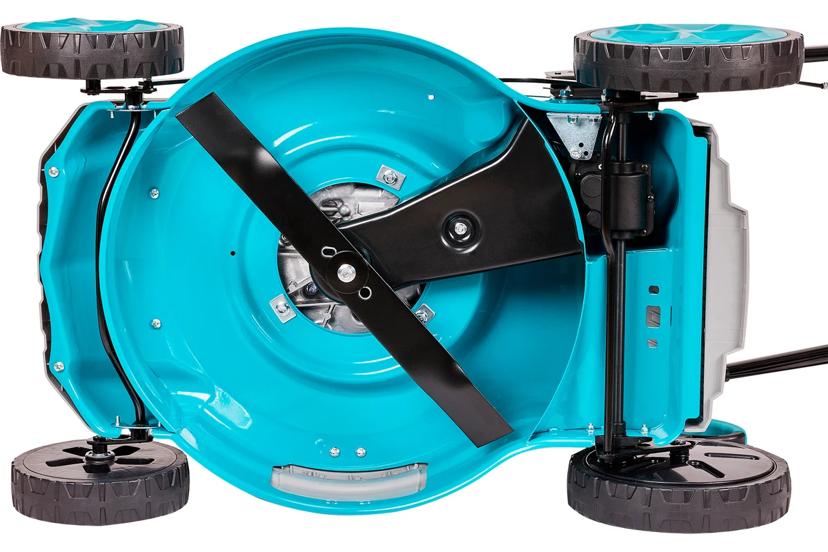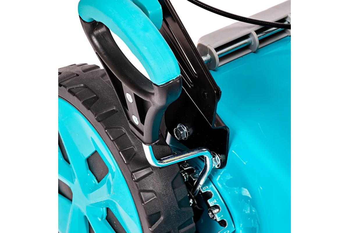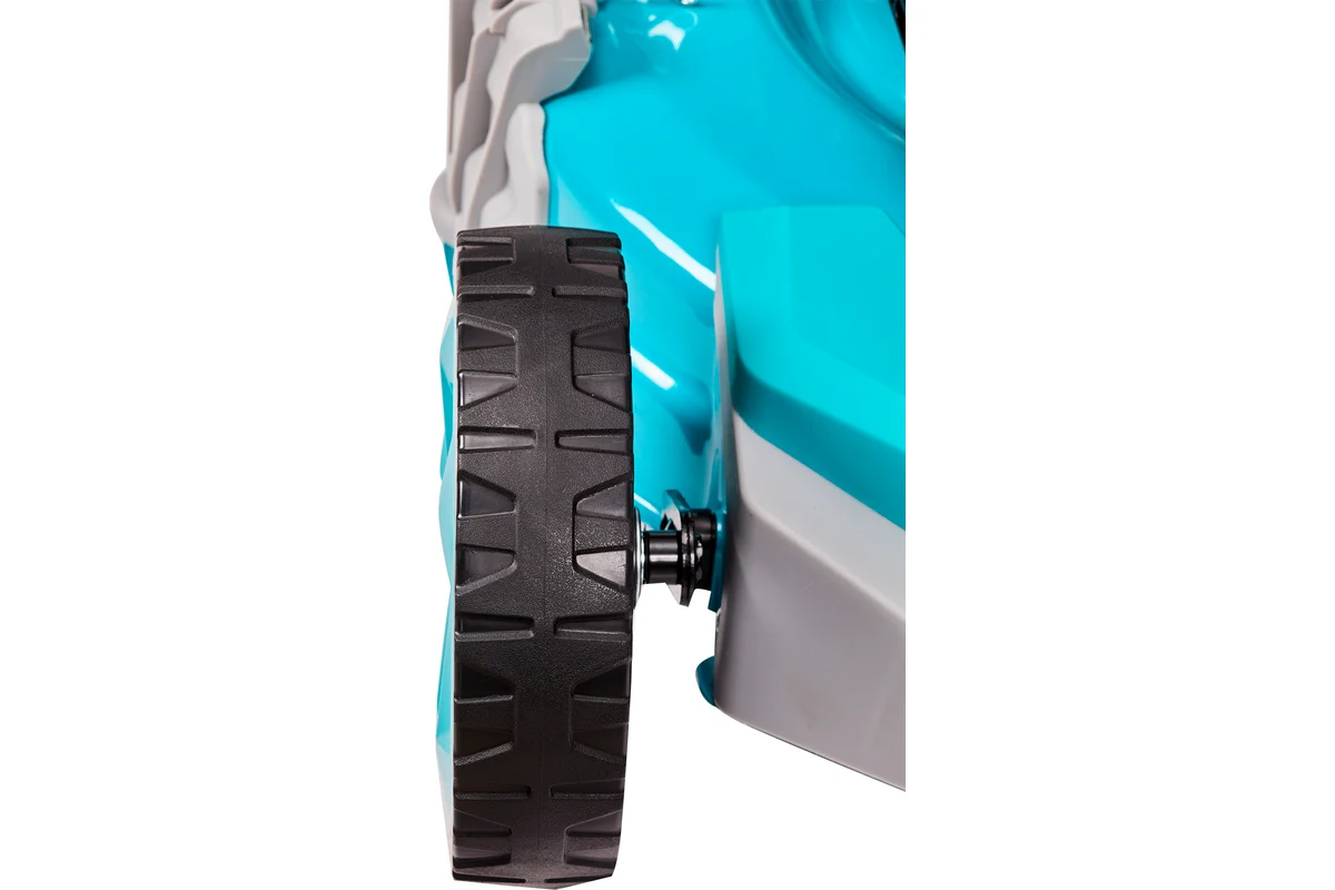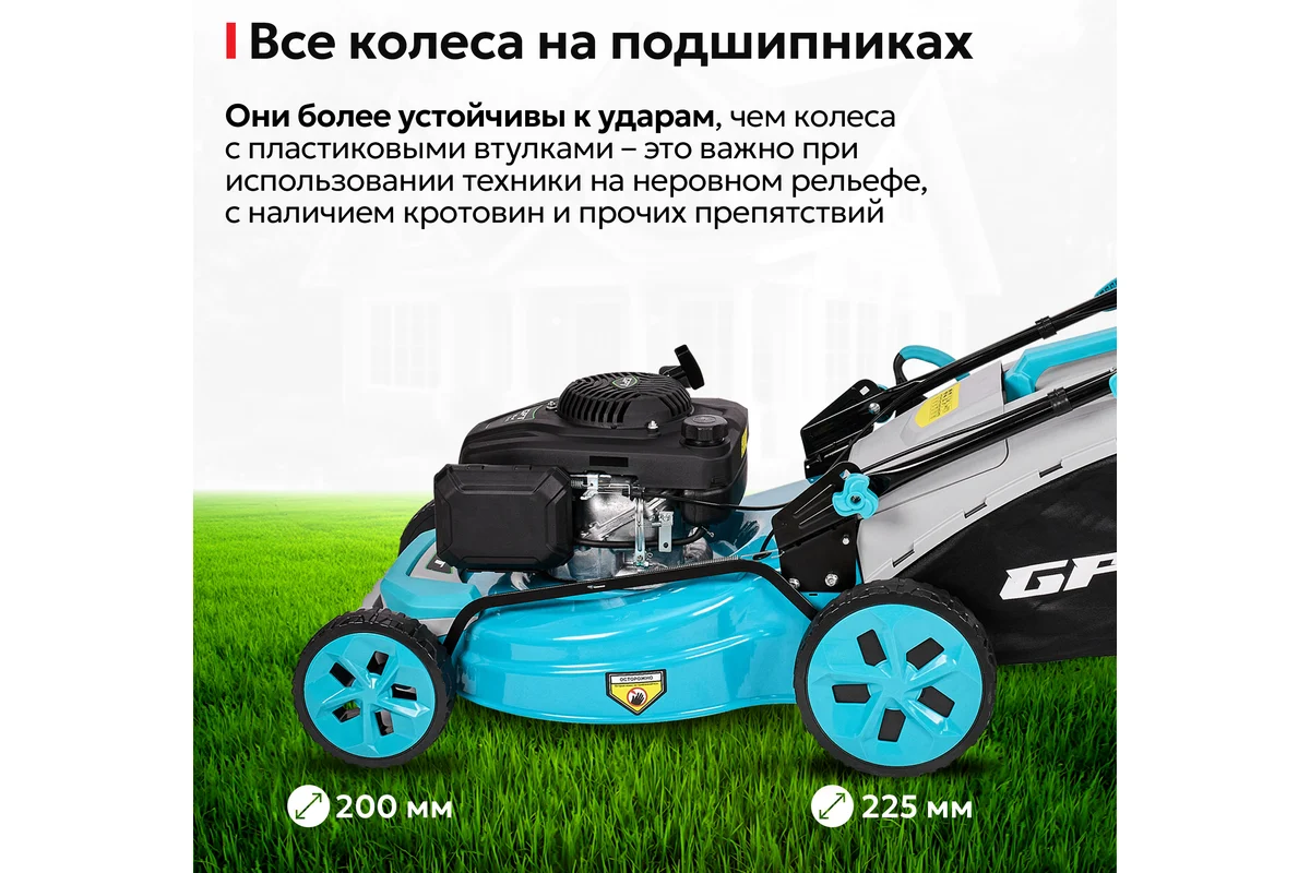 -Привод на задние колеса и большие обрезиненные колеса на подшипниках с диаметром 25,5/20 см. Такая конструкция в сочетании с шириной скашивания 510 мм обеспечивает отличный результат на участках с любой площадью: колеса не скользят на влажной траве, снижается вибрация и шум при движении.