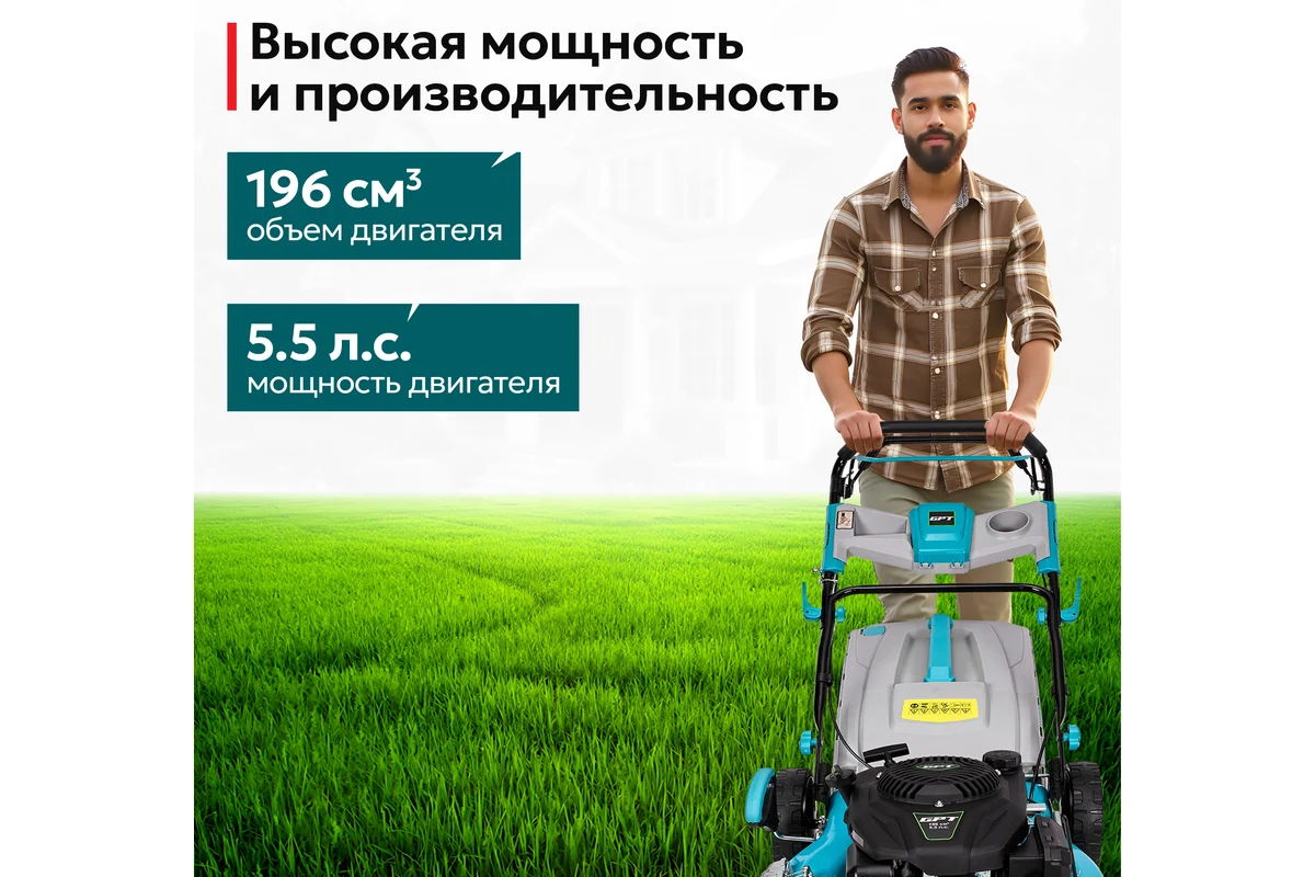 У двигателя оптимальный объем 196 см3, приличная мощность 4 кВт / 5,5 л.с. и высокий крутящий момент 12Nm при 2500 об/мин. Садовая техника с такими параметрами идеально подходит для быстрого и качественного скашивания травы на садовых участках и газонах.