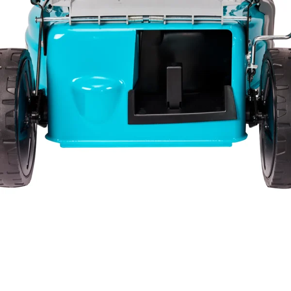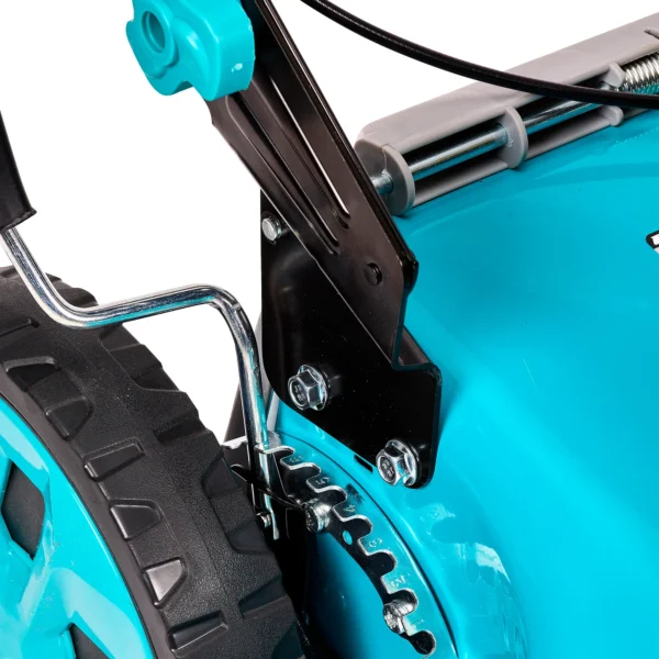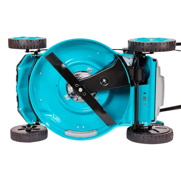 -Привод на задние колеса и большие обрезиненные колеса на подшипниках с диаметром 25,5 и 20 см. Такая конструкция обеспечивает высокую проходимость и маневренность газонокосилки.