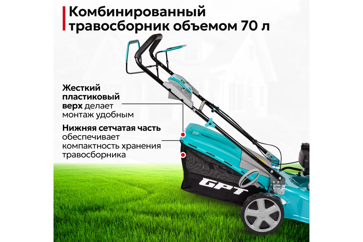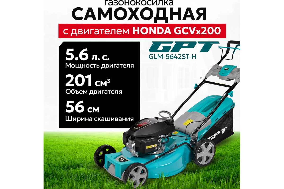 Для получения ухоженного газона лучше купить профессиональную бензиновую газонокосилку GPT GLM-Т5642ST-H. Эффективной ее делает современный 4-тактный бензиновый двигатель Honda GCVx200 с объемом 201 см3 и мощностью 4,2 кВт (5,6 л.с.).