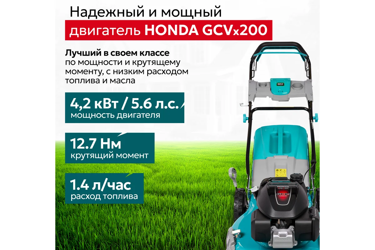 -Двигатель Honda GCVx200 Это японское качество сборки и проверенные технологии Он обеспечивает стабильную тягу при скашивании густой или влажной травы и рассчитан на многочасовую работу без перегрева и потери мощности, что делает его идеальным для частого использования на больших участках