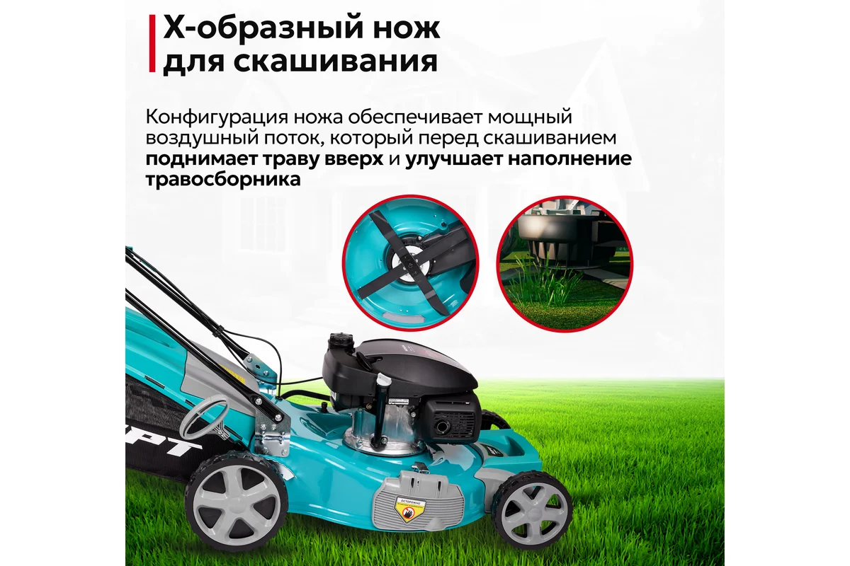 -Мульчирование За счет Х-образного ножа мульча получается очень мелкой, что обеспечивает подпитку для быстрого роста и идеального вида газона