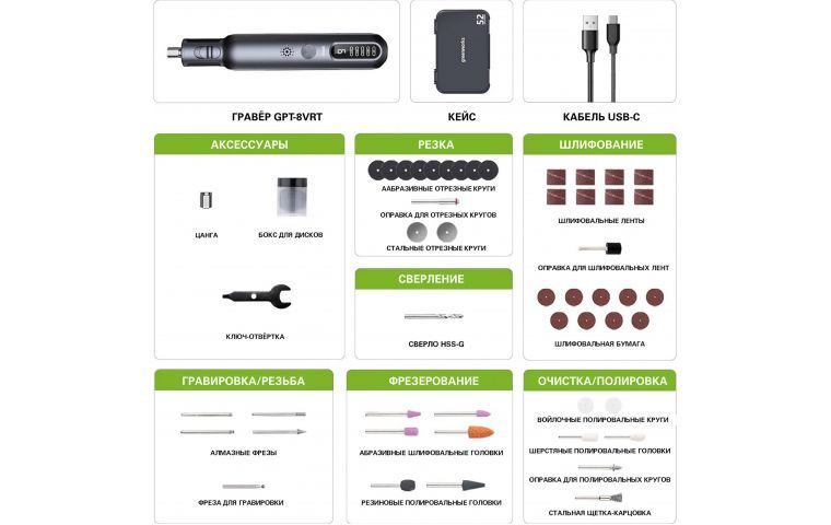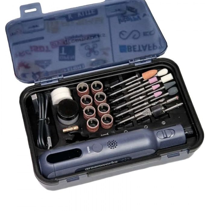 Гравер Greenworks GPT-8VRT – это компактный инструмент для выполнения различных задач, включая резку, полировку, шлифовку, заточку, сверление и гравировку.