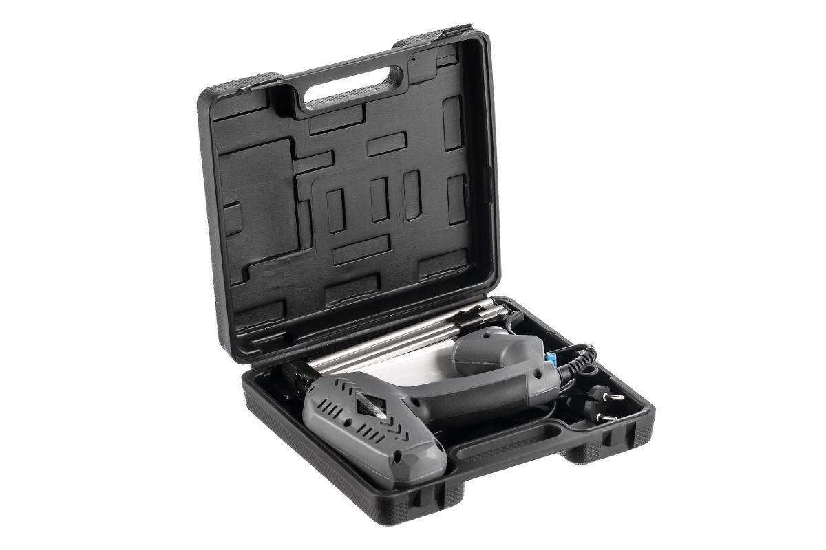 - Оснащен регулировкой силы удара для максимально точной настройки в зависимости от твердости материала и длины скоб.