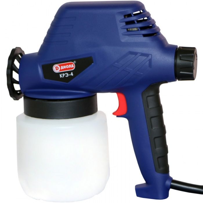 Краскораспылитель Диолд КРЭ-4 является инструментом бытового назначения и предназначен для распыления лакокрасочных материалов, грунтовок, морилок, средств защиты древесины и растений, масел, антикоррозионных покрытий, дезинфицирующих средств на основе растворителей и воды, а также других неэлектропроводных жидкостей на обрабатываемые поверхности методом безвоздушного распыления.