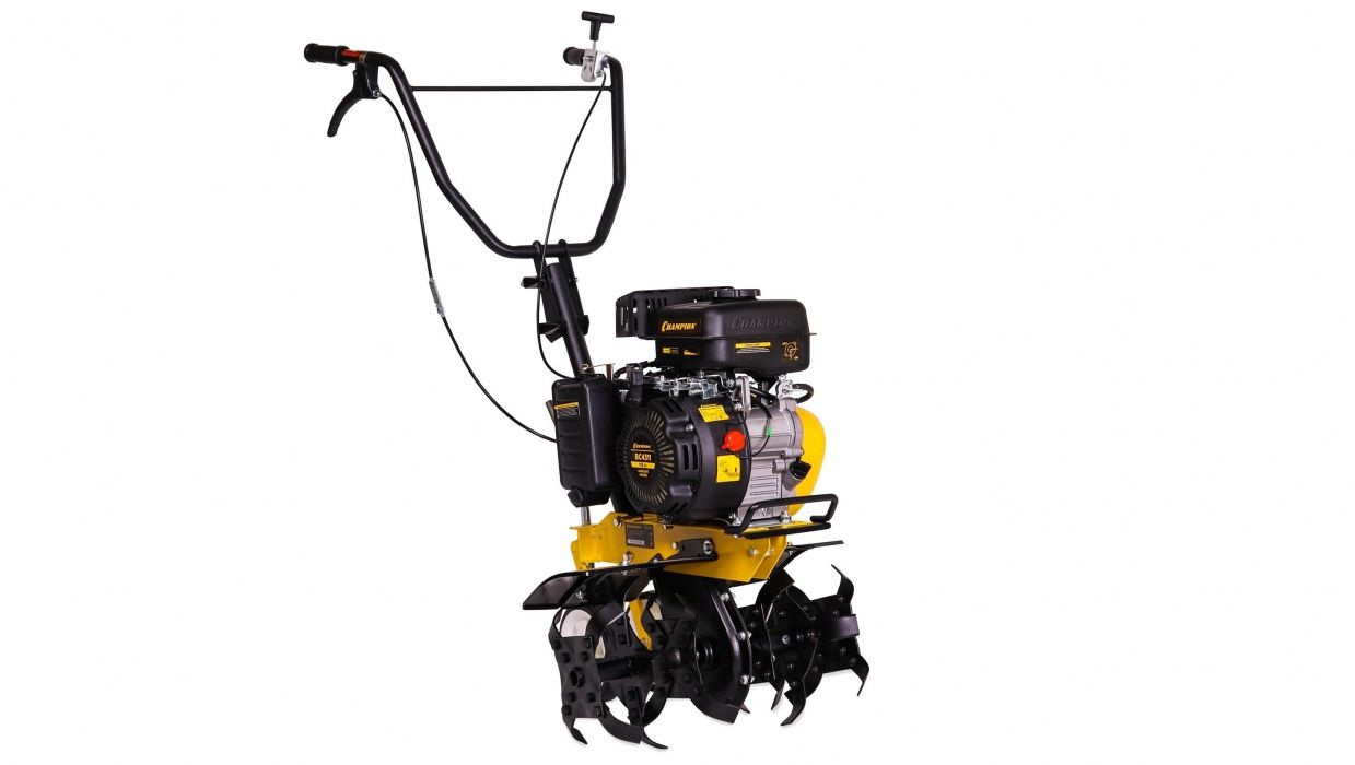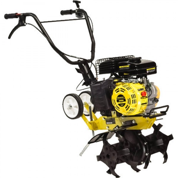 Изделие оснащено 4-хтактным двигателем Champion с верхним расположением клапанов. Обороты двигателя регулируются с панели оператора. Мотокультиватор имеет 1 скорость переднего хода.