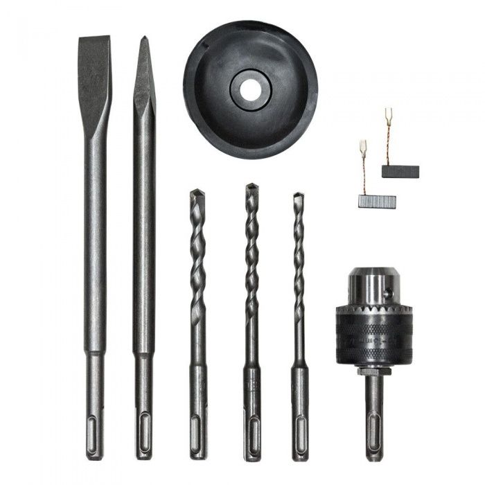 • комплект оснастки по бетону (3 сверла (6x150 мм, 8x150 мм, 10x150 мм), 2 зубила(пиковое 250 мм, плоское 20x250 мм))