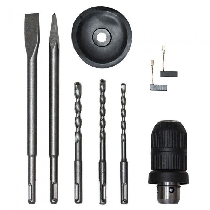 • комплект оснастки по бетону (3 сверла (6x150 мм, 8x150 мм, 10x150 мм), 2 зубила(пиковое 250 мм, плоское 20x250 мм))