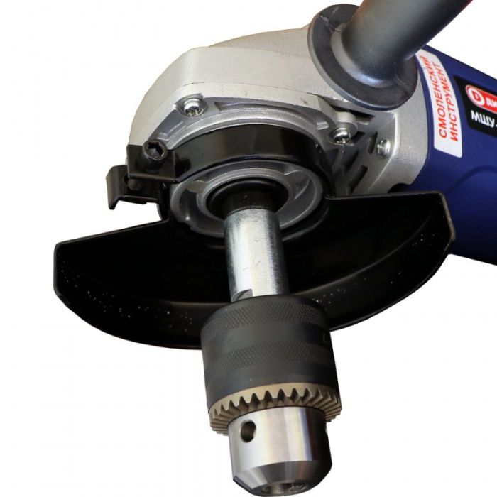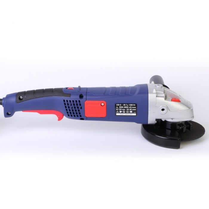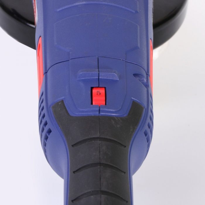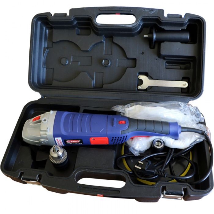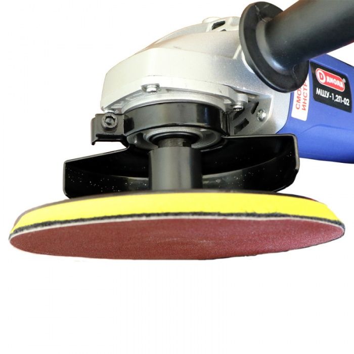 Инструмент оснащен двигателем мощностью 1200 Вт и рабочим диском диаметром 125 мм. Есть возможность использования полировальных насадок и шлифовальных шкурок диаметром 180 мм, а также сверлильный патрон.