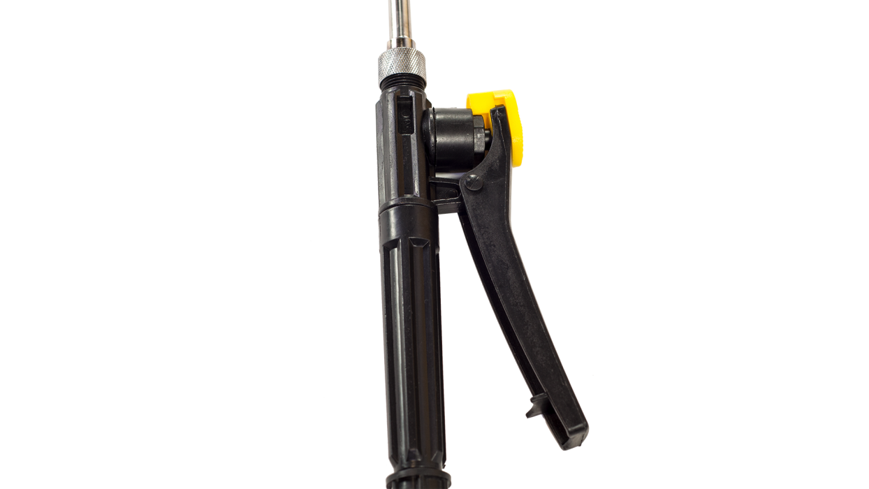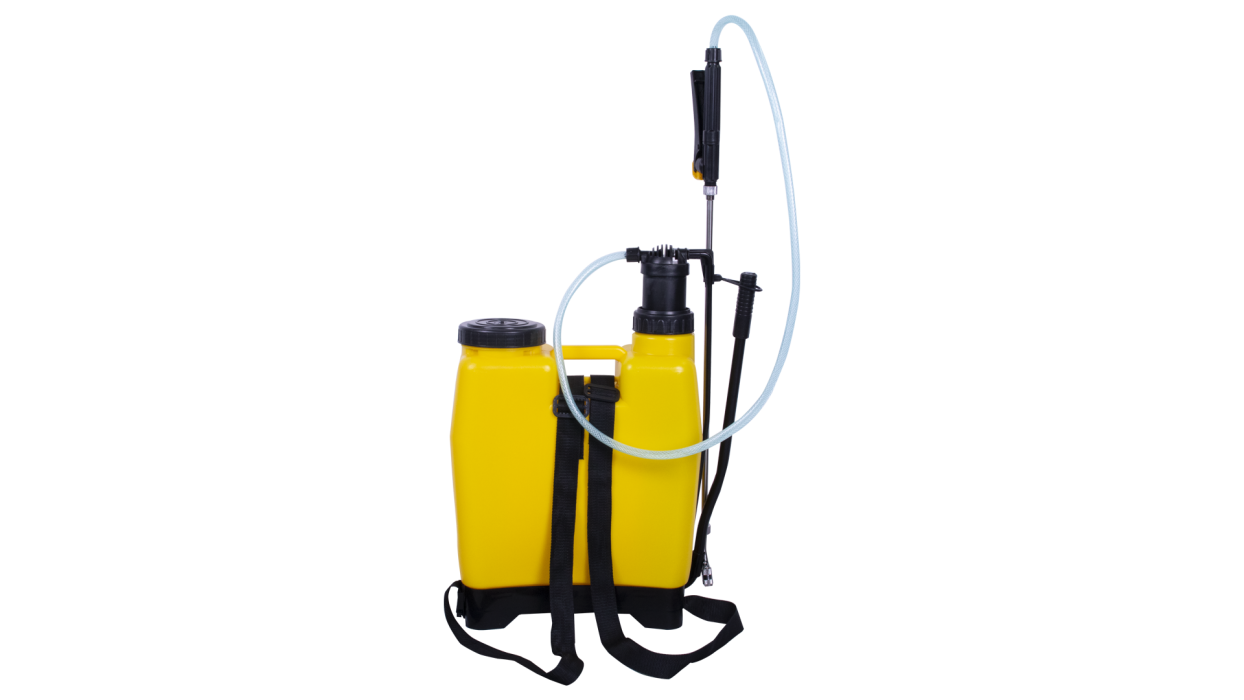 Ручной рычажный садовый опрыскиватель оборудован 12-литровым баком для жидкости и работает благодаря рычагу, который передает усилие через шатун поршню насоса. Насос создает давление жидкости, которая выбрасывается через сопло форсунки.