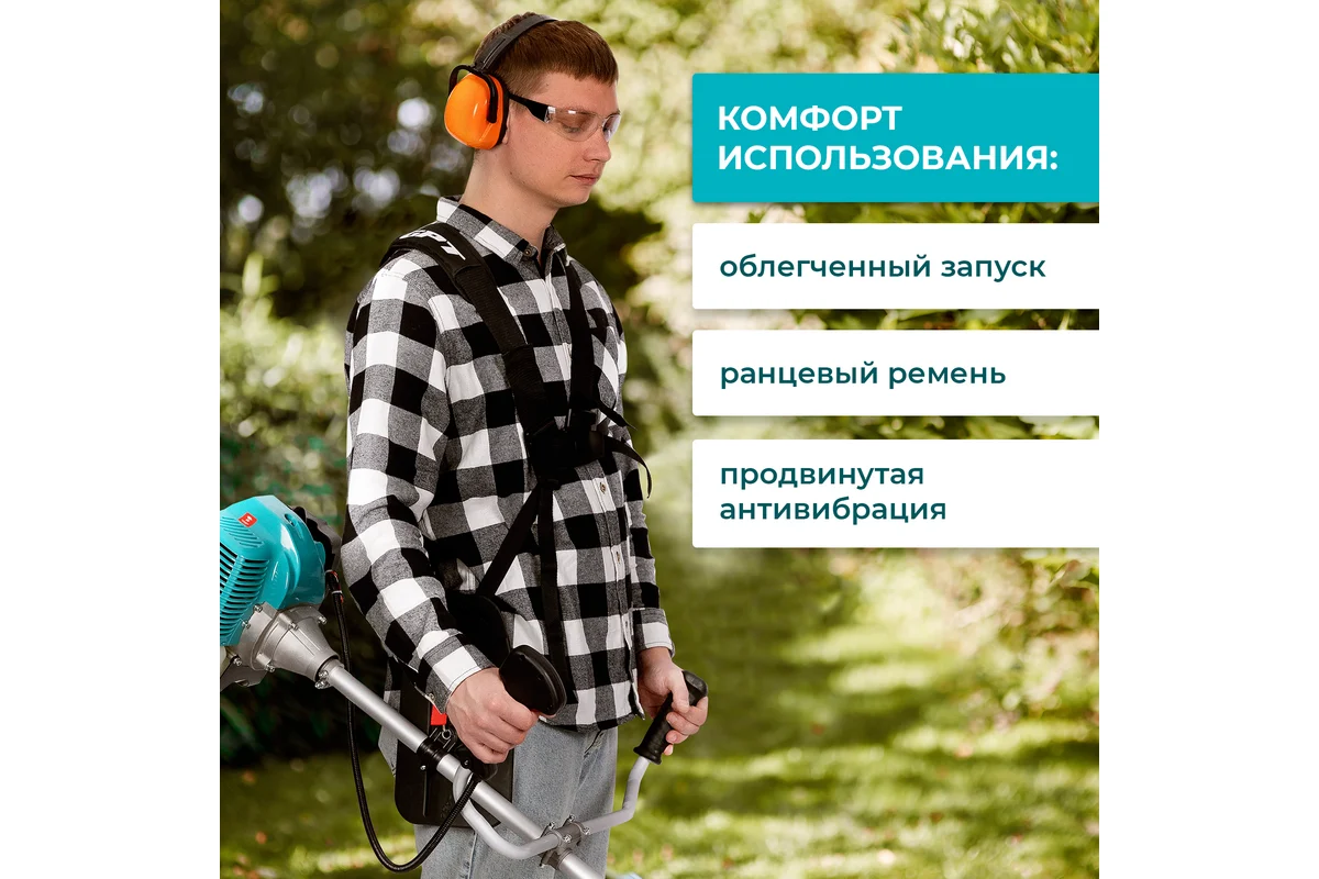 Универсальный триммер, оснащённый системой легкого запуска и ранцевым ремнем с системой гашения вибрации, отлично подойдёт для небольших и