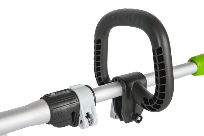 Нижнее расположение двигателя обеспечивает отличную балансировку и снижает нагрузку на руки. Телескопическая алюминиевая штанга и регулируемая D-образная рукоятка позволяют настроить инструмент под любой рост. Поворотная головка на шарнире и опорное колесо превращают триммер в удобный кромкорез для аккуратной обработки краев газона под разными углами.